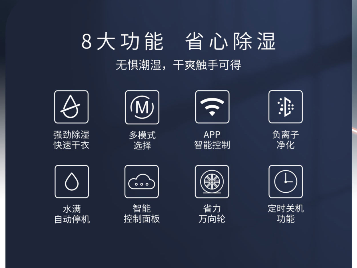 推荐面积 :20-40m²除湿量: 28L/天,WIFI智能APP远程控制
